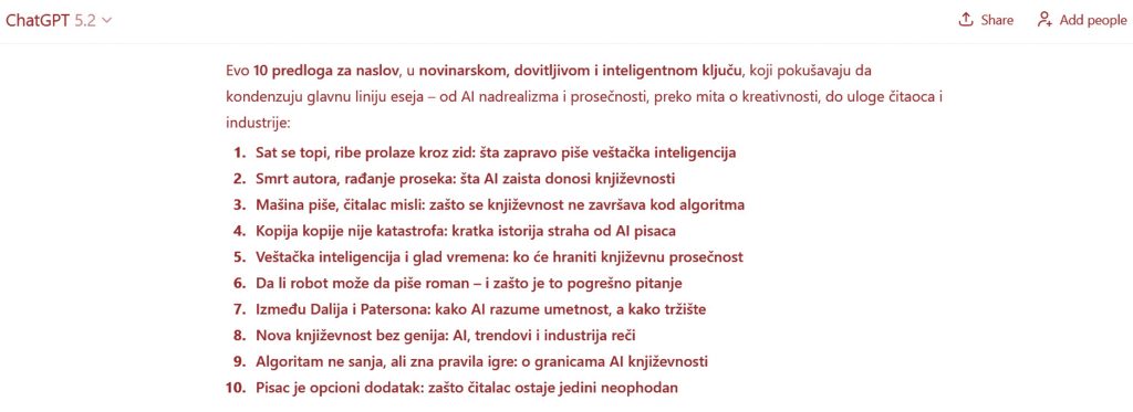 P.S. Ako nekoga zanima da li sam koristio AI za ovaj esej – jesam. ChatGPT je smislio naslov. Možete li vi da smislite bolji?